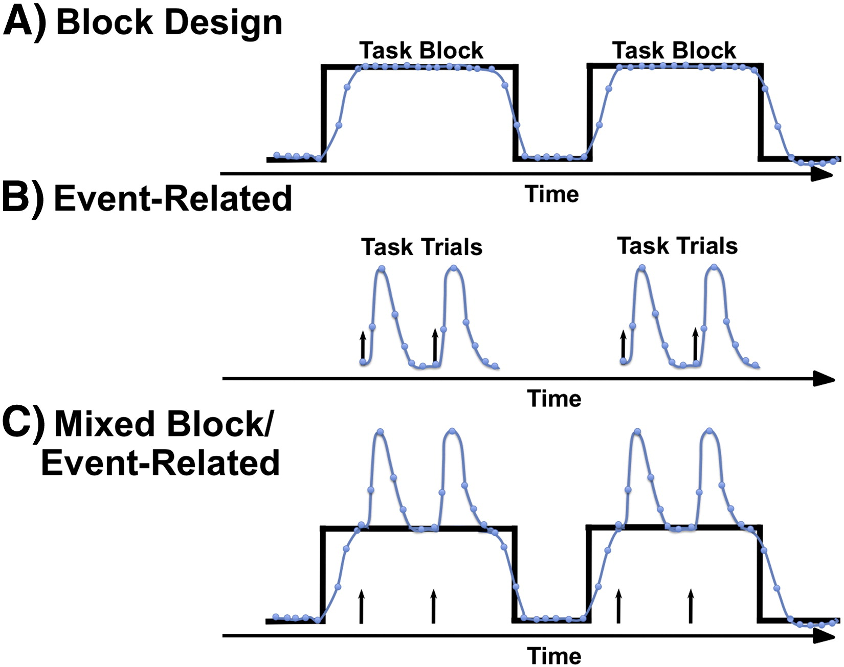 - Block design: repeated task periods alternating with baseline (e.g. 30s task, 30s rest).