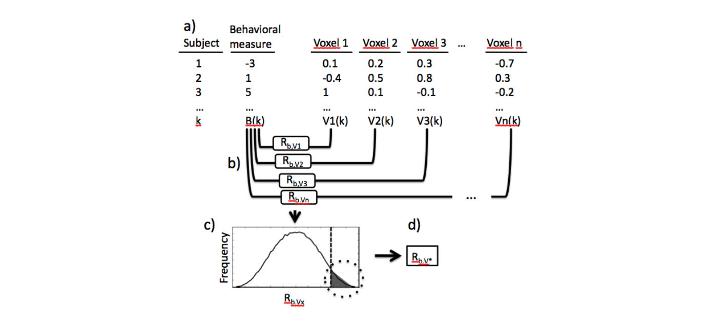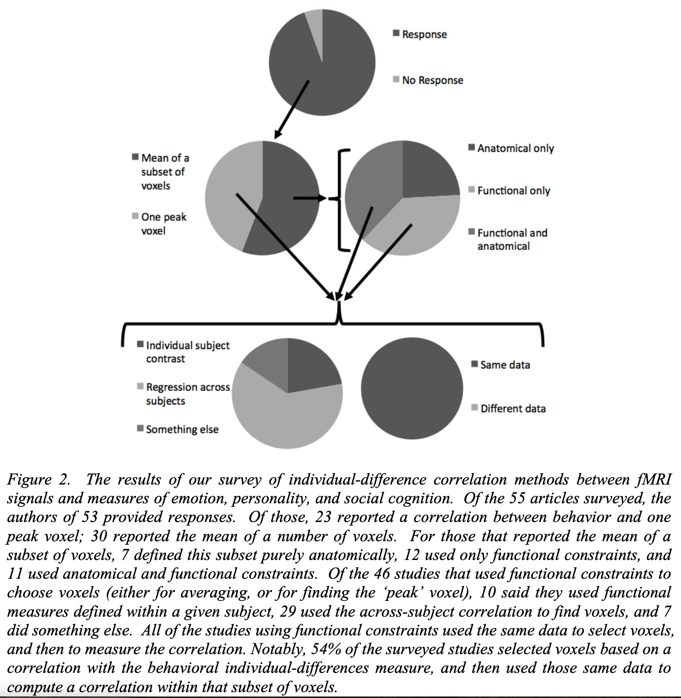 “Writing in NeuroImage, Sander et al. (2005) reported that a subject’s proneness to anxiety reactions (as measured by an index of the Behavioral Inhibition System; Carver and White, 1994) correlated at r=.96 with the difference in activation of the right cuneus to attended versus ignored angry speech.”